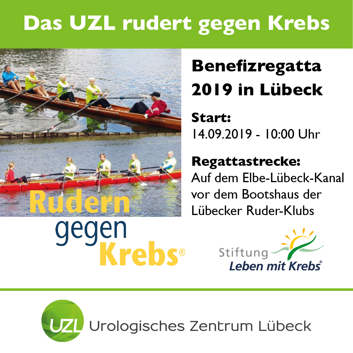 Am Samstag, den 14. September ab 10:00 Uhr, findet in Lübeck, vor der historischen Kulisse der Lübecker Altstadt, die Benefizregatta „Rudern gegen Krebs“ statt. Start der 250 m langen Strecke auf dem Elbe-Lübeck-Kanal ist bei den Lübecker Ruderklubs.