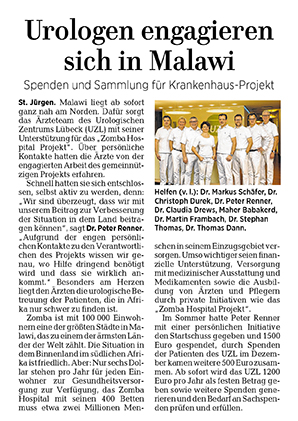 Vielen Dank an die Lübecker Nachrichten für den Bericht über unser Engagement für das Zomba Hospital Projekt e.V. in der Ausgabe vom 7./8. Januar 2018 – wir freuen uns, wenn wir viele weitere Unterstützer motivieren können.